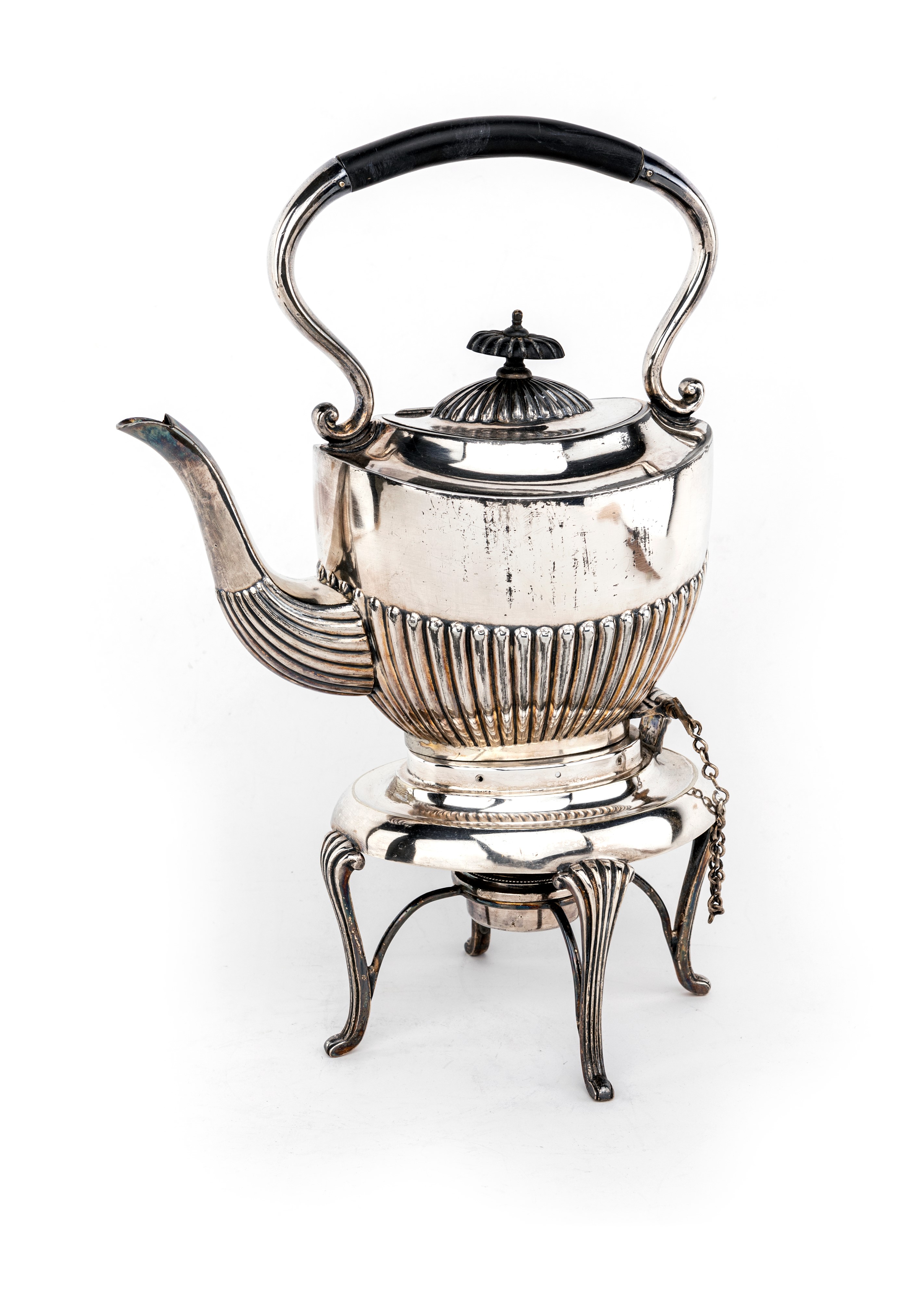 Teiera in sheffield con rechaud, Inghilterra, fine del XIX secolo