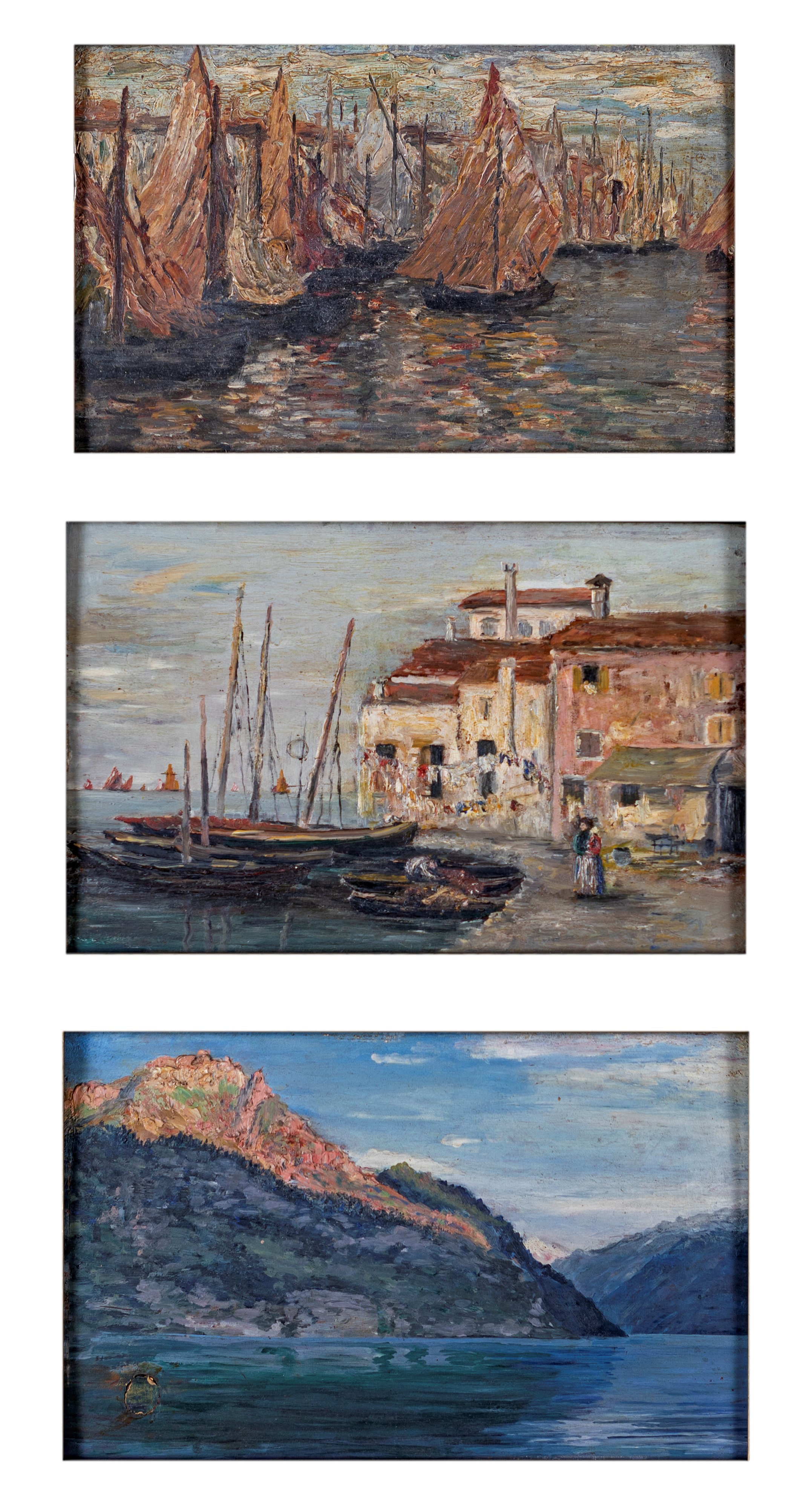 B) Marina con barche, cm 18,5x30, misure in cornice cm 25,5x36. Firma e titolo al verso non decifrate