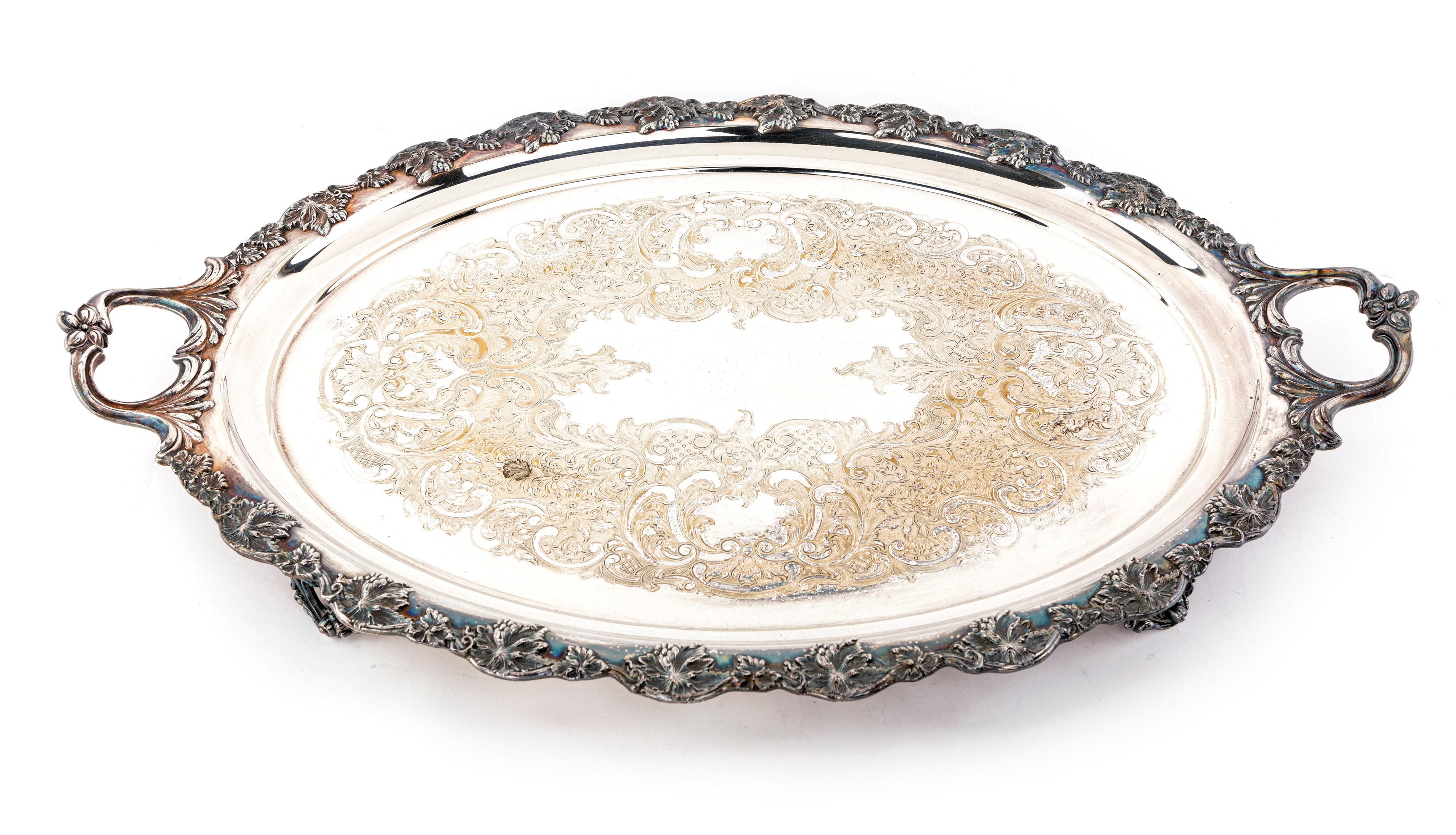 di forma ovale con manici e fitta decorazione incisa a volute, motivi vegetali e fiori; orlo sottolineato da tralci di vite e pampini