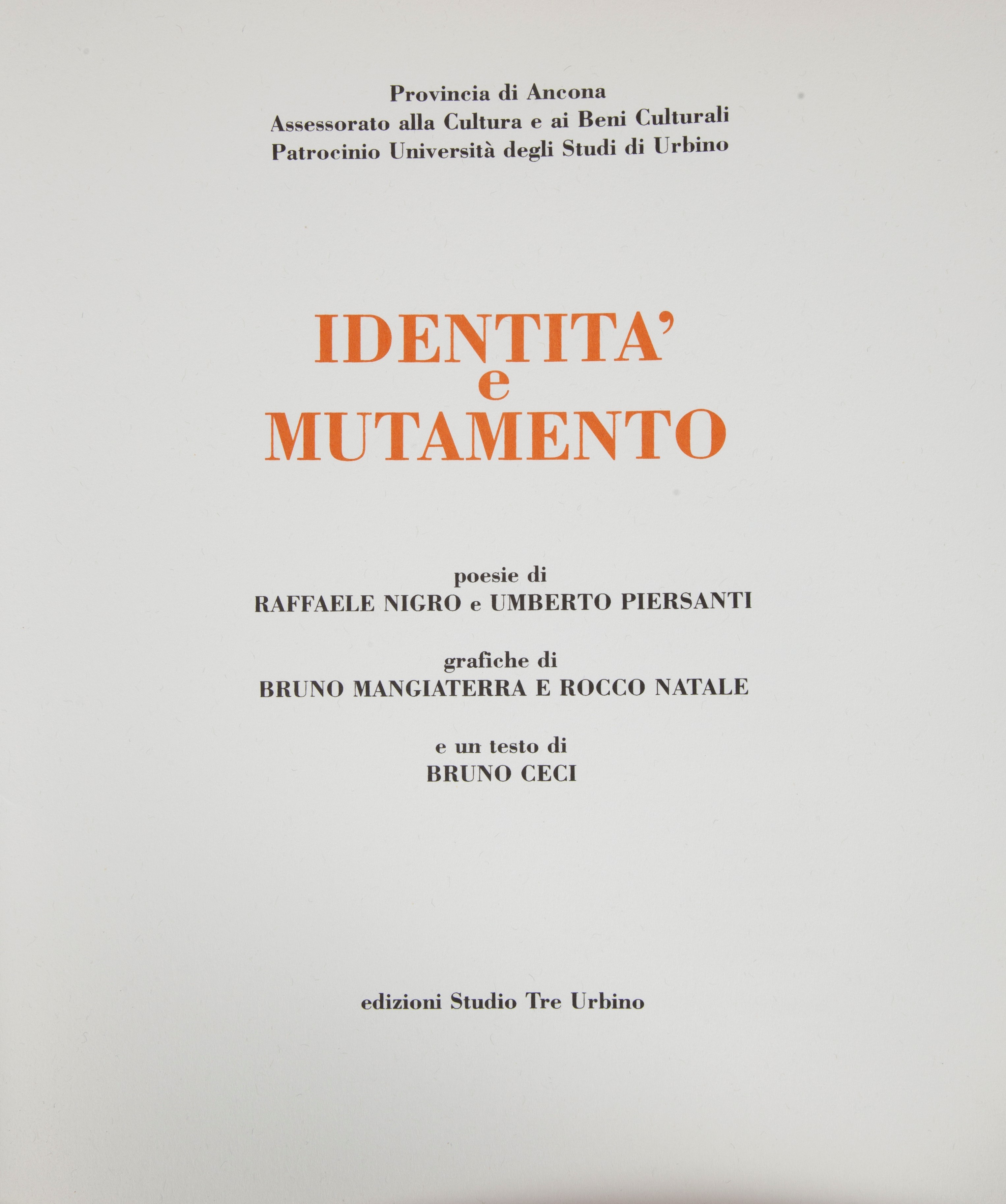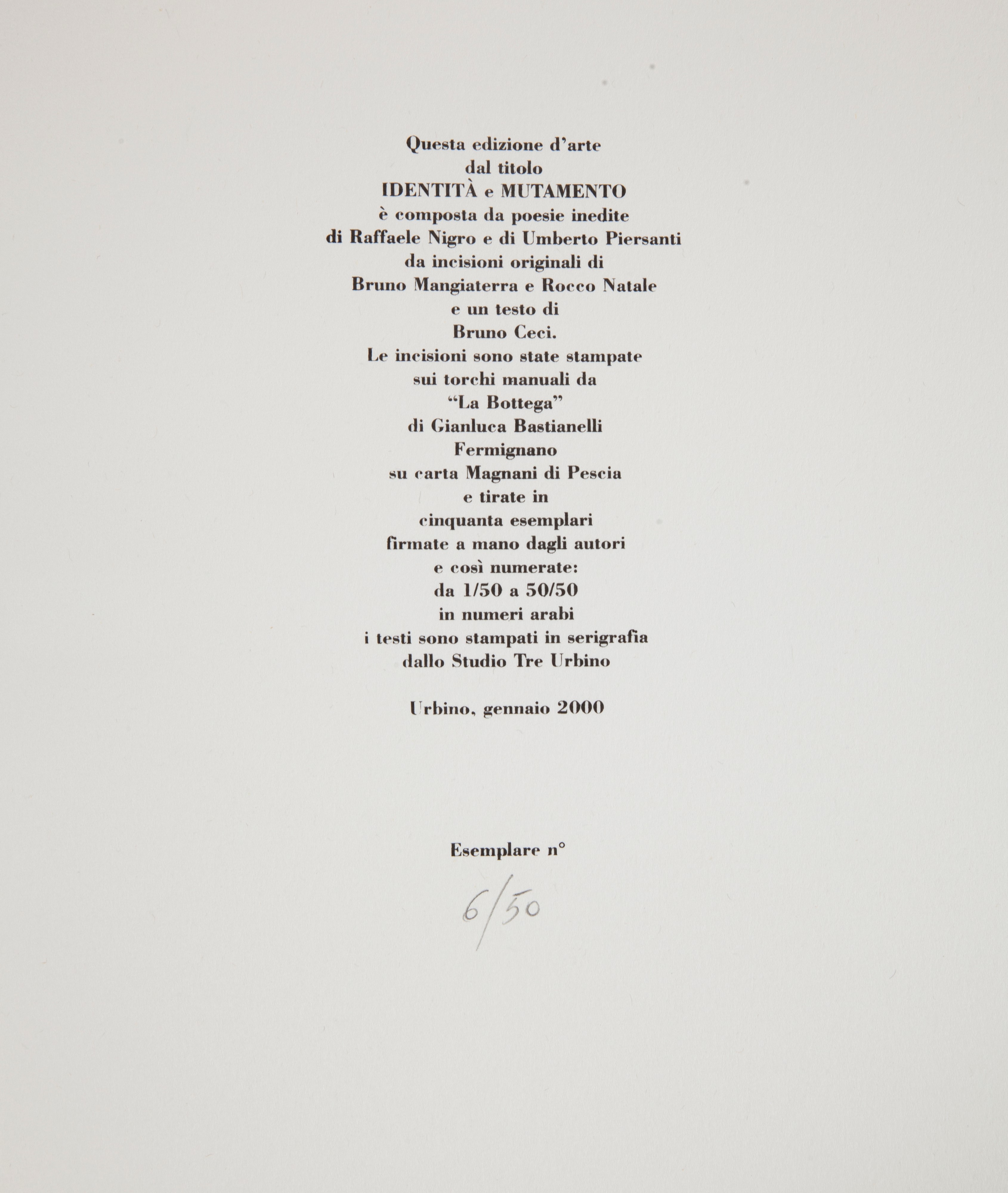 cm 35x30 Edizioni Studio Tre Urbino, 2000 Album con poesie inedite di Raffaele Nigro e Umberto Piersanti con 4 incisioni originali di Bruno Mangiaterra e Rocco Natale. Testo di Bruno Ceci. Le incisioni sono state stampate su torchi manuali La bottega di Gianluca Bastianelli su carta Magnani di Pescia. Tiratura in 50 esemplari (ns. nr. 6) numerati firmate a mano dagli autori. Testi stampati in serigrafia dallo Studio Tre di Urbino. Entro cofanetto di legno.