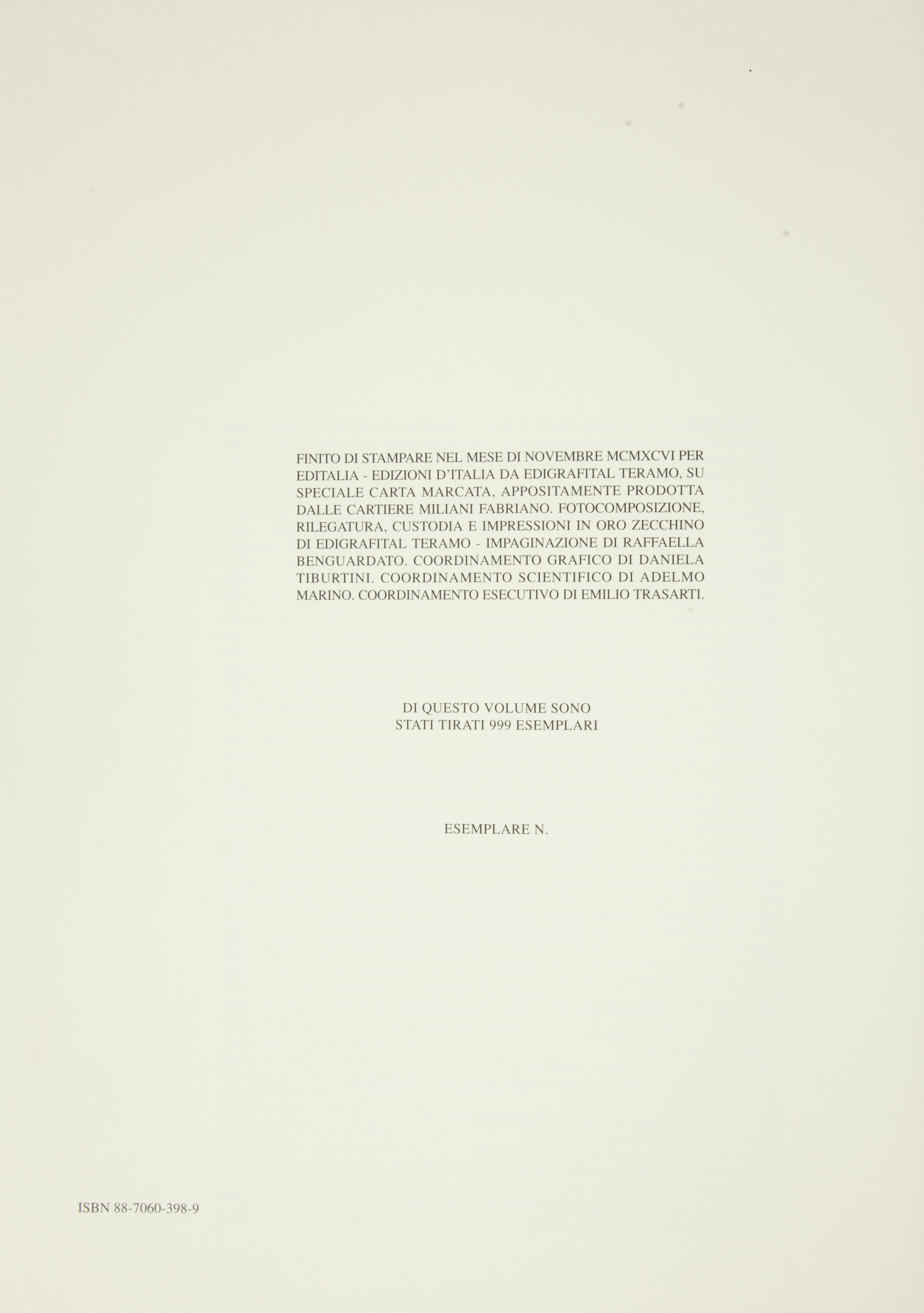 cm 40x30 Editalia, Roma 1996 Tiratura limitata in 999 esemplari. Con 100 incisioni. Legatura in pelle primo fiore della ditta Antinori, con impressioni in oro zecchino sul piatto e sul dorso. Stampata su carta speciale Cartiere Miliani Fabriano. Custodia in pelle con stampa.
