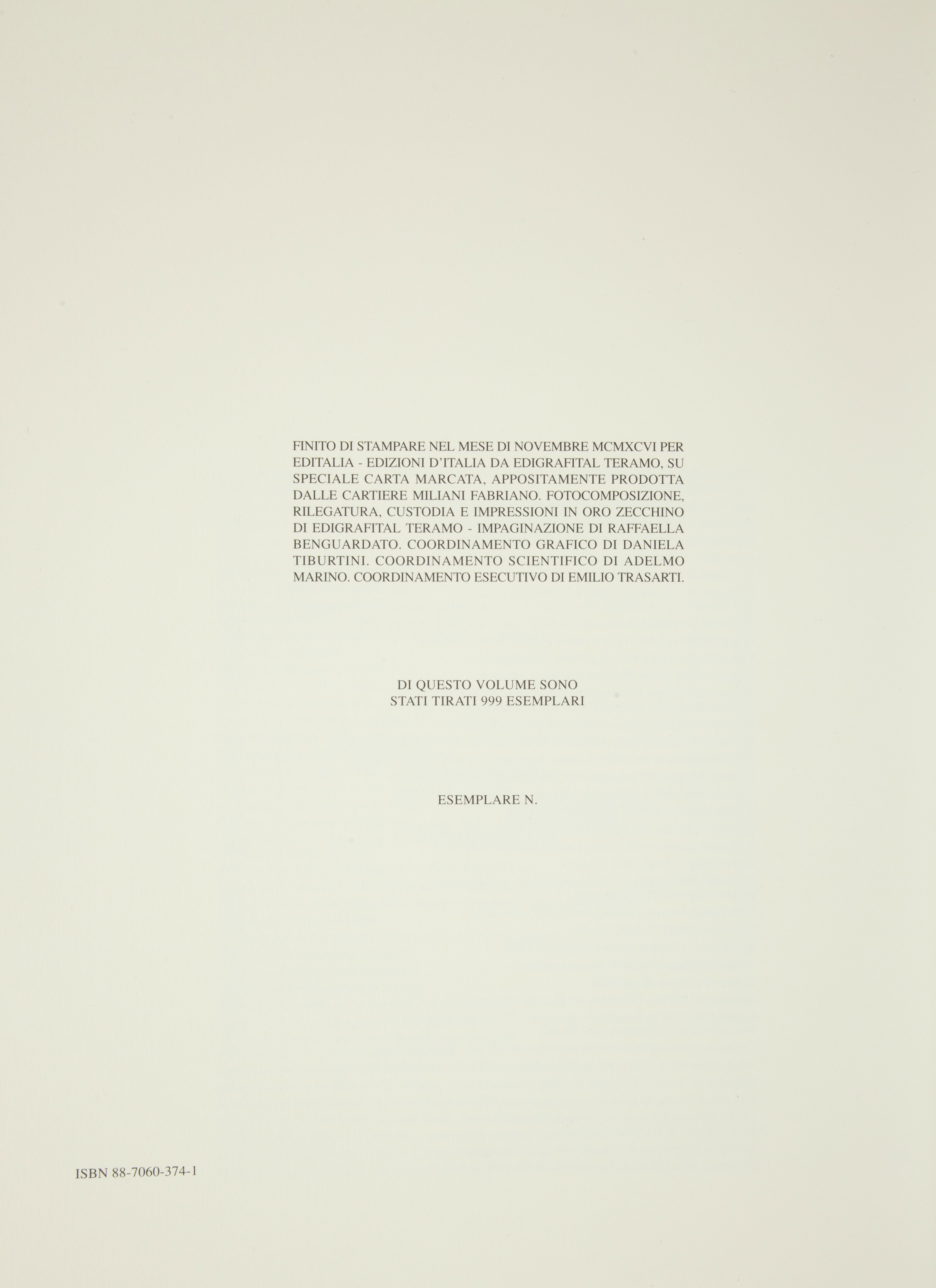 cm 40x30 Editalia, Roma 1996 Tiratura limitata in 999 esemplari. Con 100 incisioni. Legatura in pelle primo fiore della ditta Antinori, con impressioni in oro zecchino sul piatto e sul dorso. Stampata su carta speciale Cartiere Miliani Fabriano. Custodia in pelle con stampa. Come nuovo.