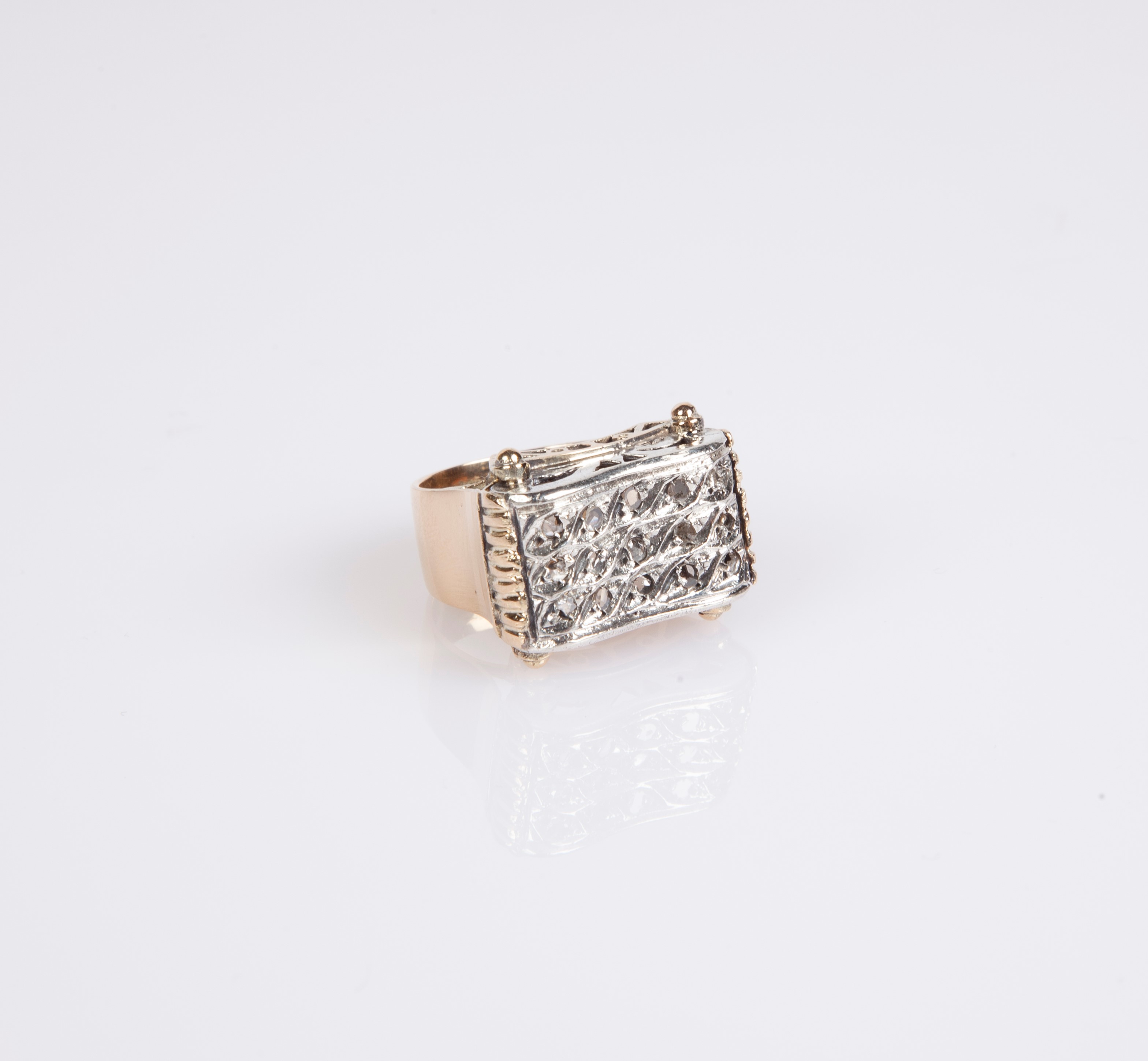 Oro a basso titolo, diamanti in taglio rosa. Peso complessivo gr. 11,20.