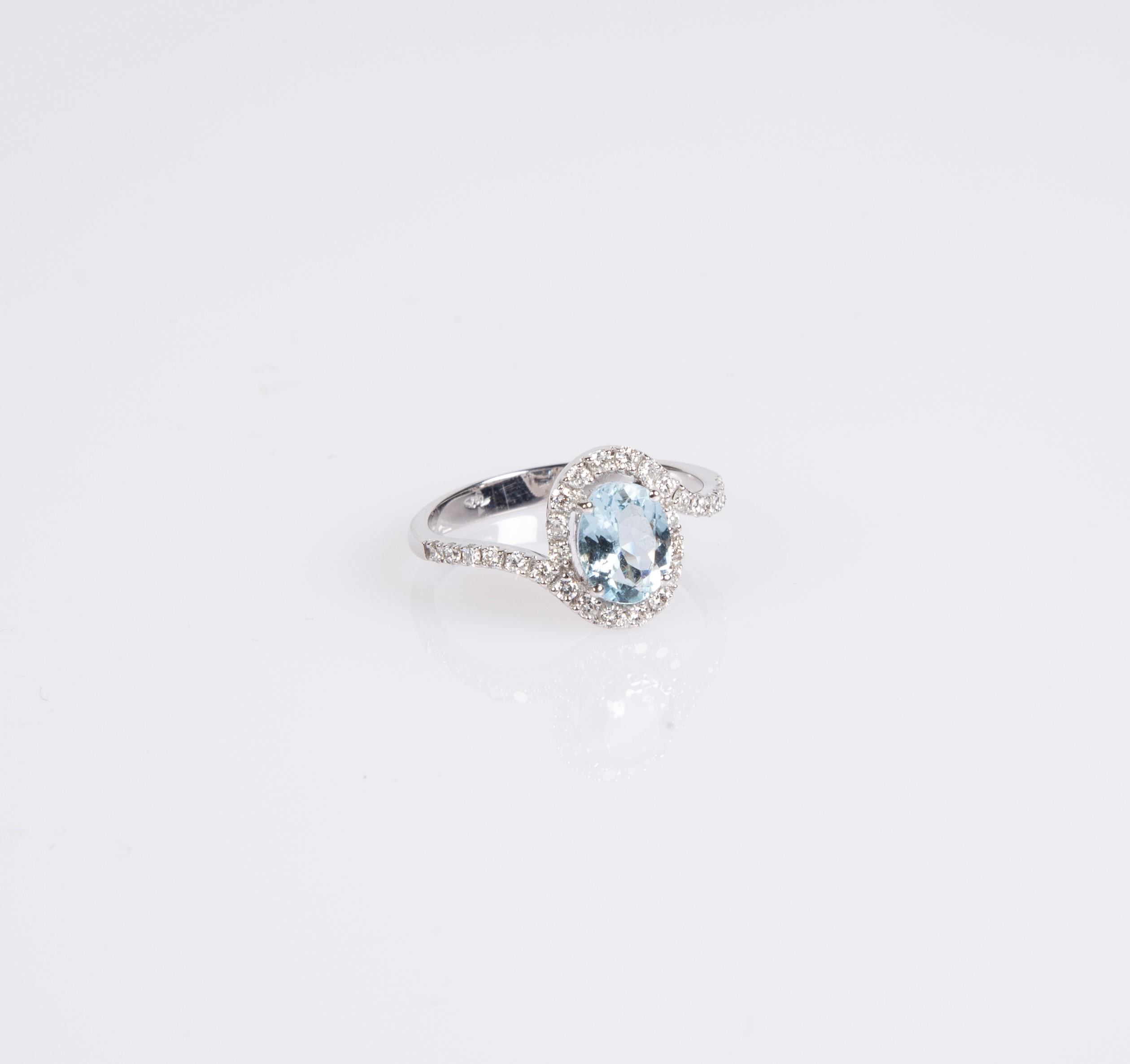 Oro bianco 750/000, acquamarina in taglio ovale e brillanti ct. 0,50 ca. Peso complessivo gr.3,40