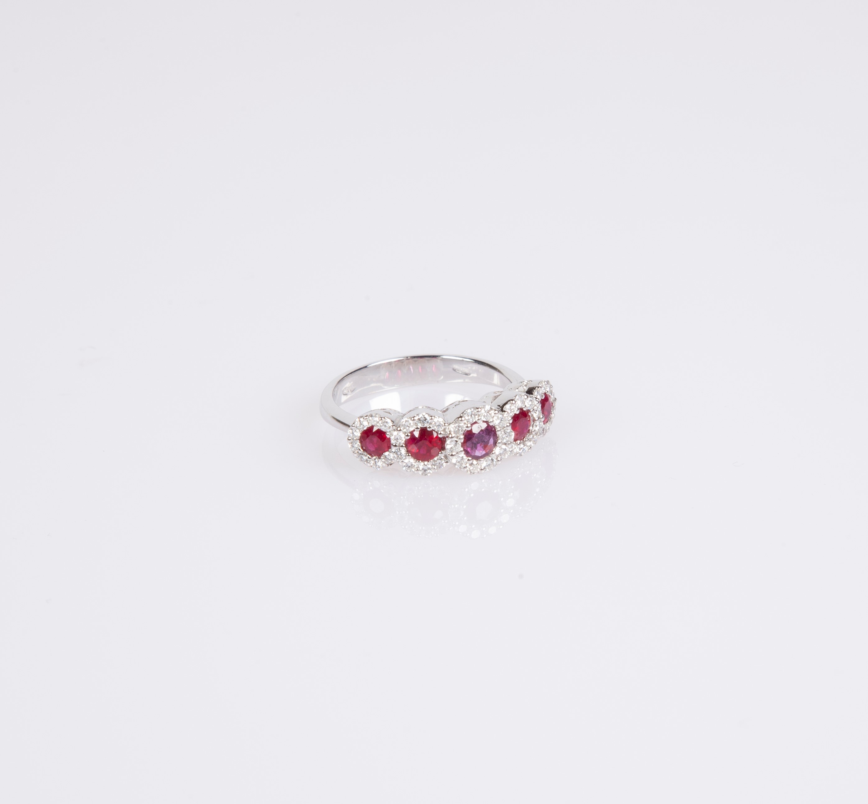 Oro bianco 750/000, rubini in taglio rotondo e brillanti ct. 0,50 ca.Peso complessivo gr 4,4