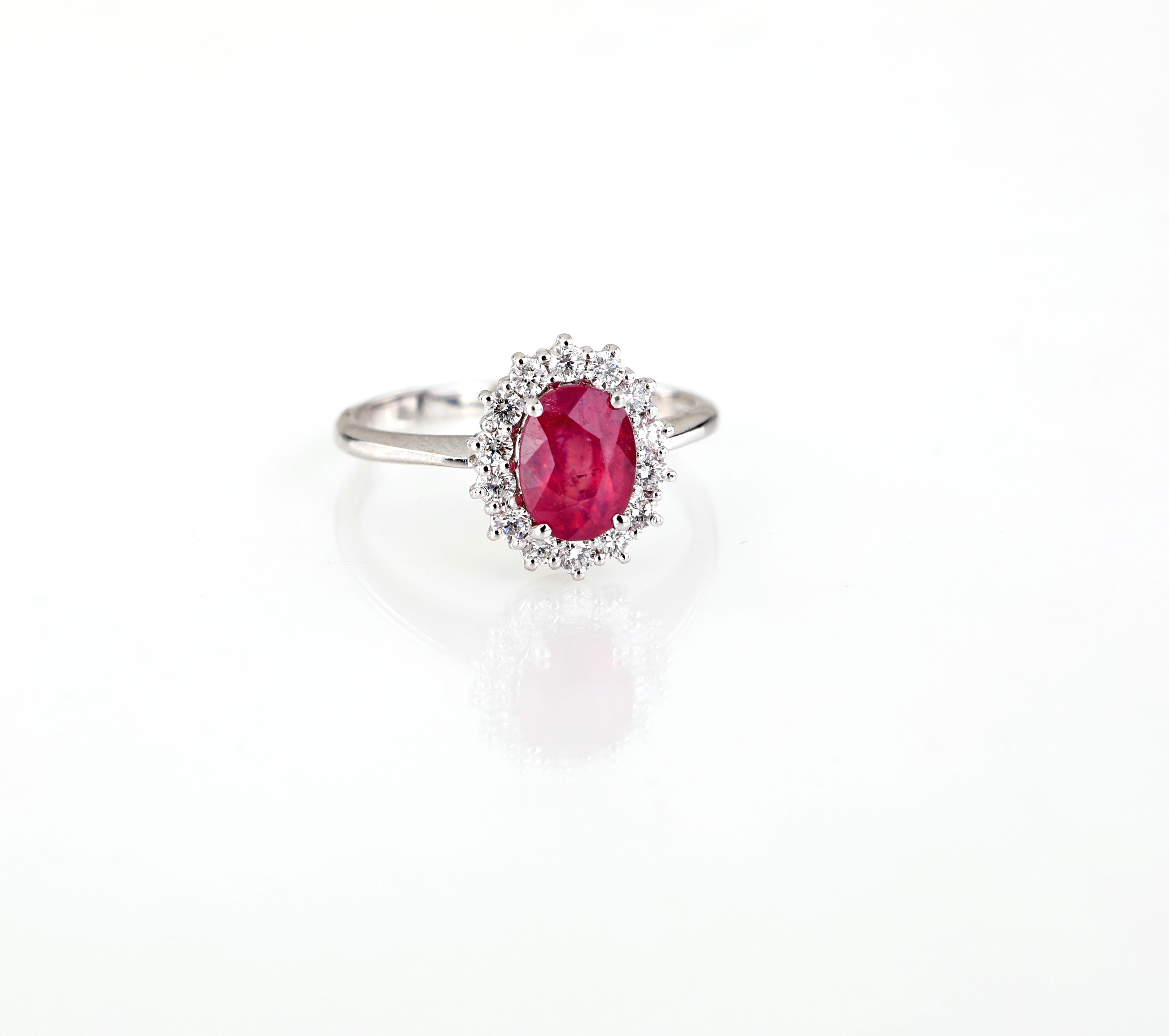 Oro bianco 750/000, rubino in taglio ovale ct.1,10 ca, diamanti in taglio rotondo brillante ct. 0,45 ca. Peso gr.4.