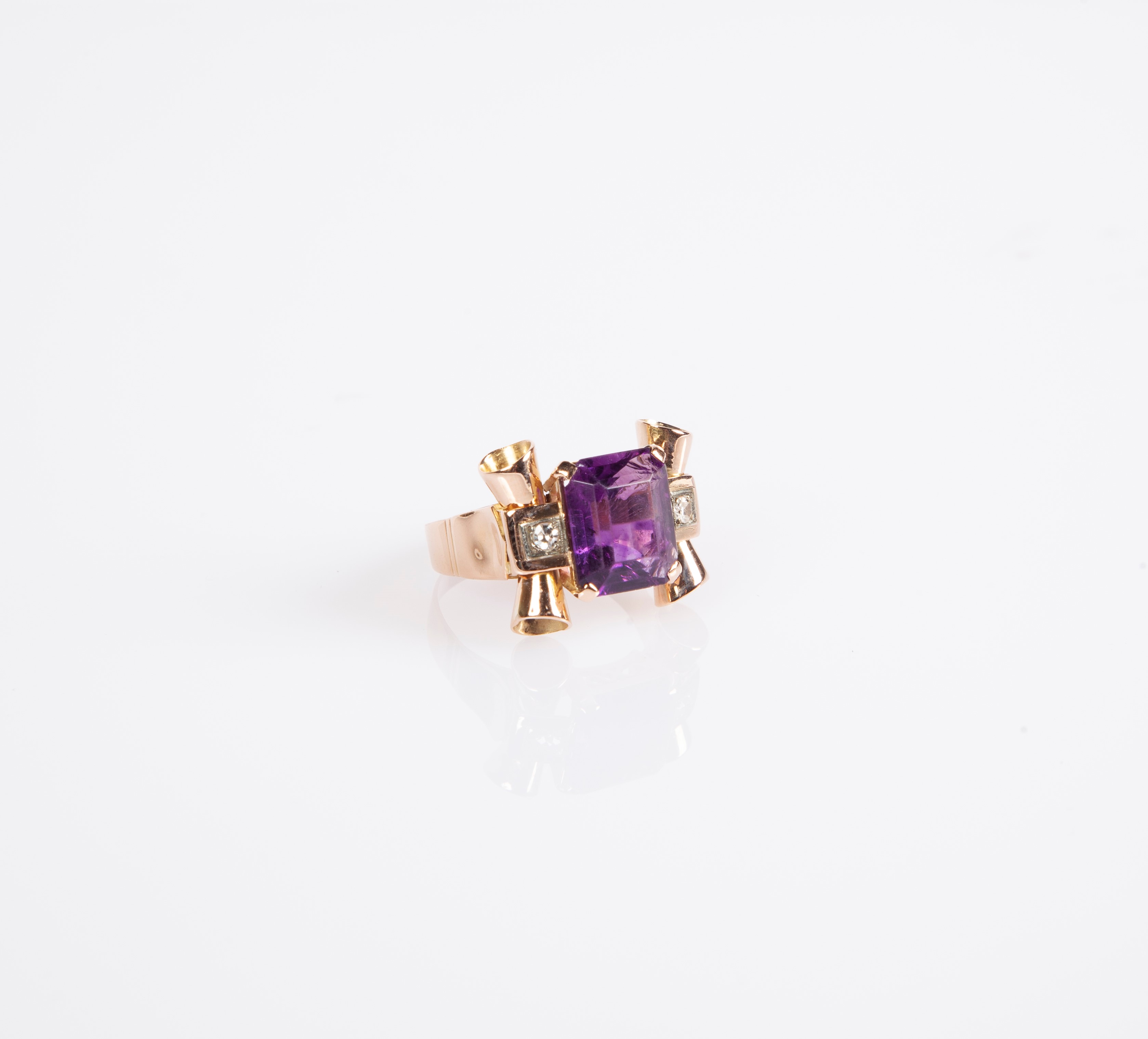 Anello rosa 750/000. Ametista taglio smeraldo. Peso complessivo gr. 6.9.