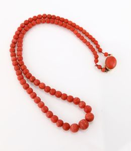 Lunghezza cm 47 Oro giallo 750/000, corallo rosso tagliato sferico, da mm. 4 a mm. 8. Peso complessivo gr 20,3 [..]