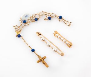 Oro giallo 750/000. Peso complessivo gr. 18,50. Spille cm 6 e cm 4, rosario cm 28.