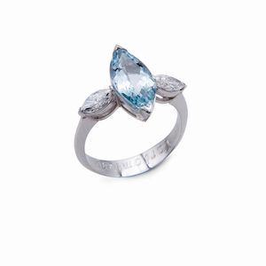 Oro bianco 750/000, peso complessivo gr. 7,7. Acquamarina ct. 4,20 ca, brillanti ct. 0,50 ca.
