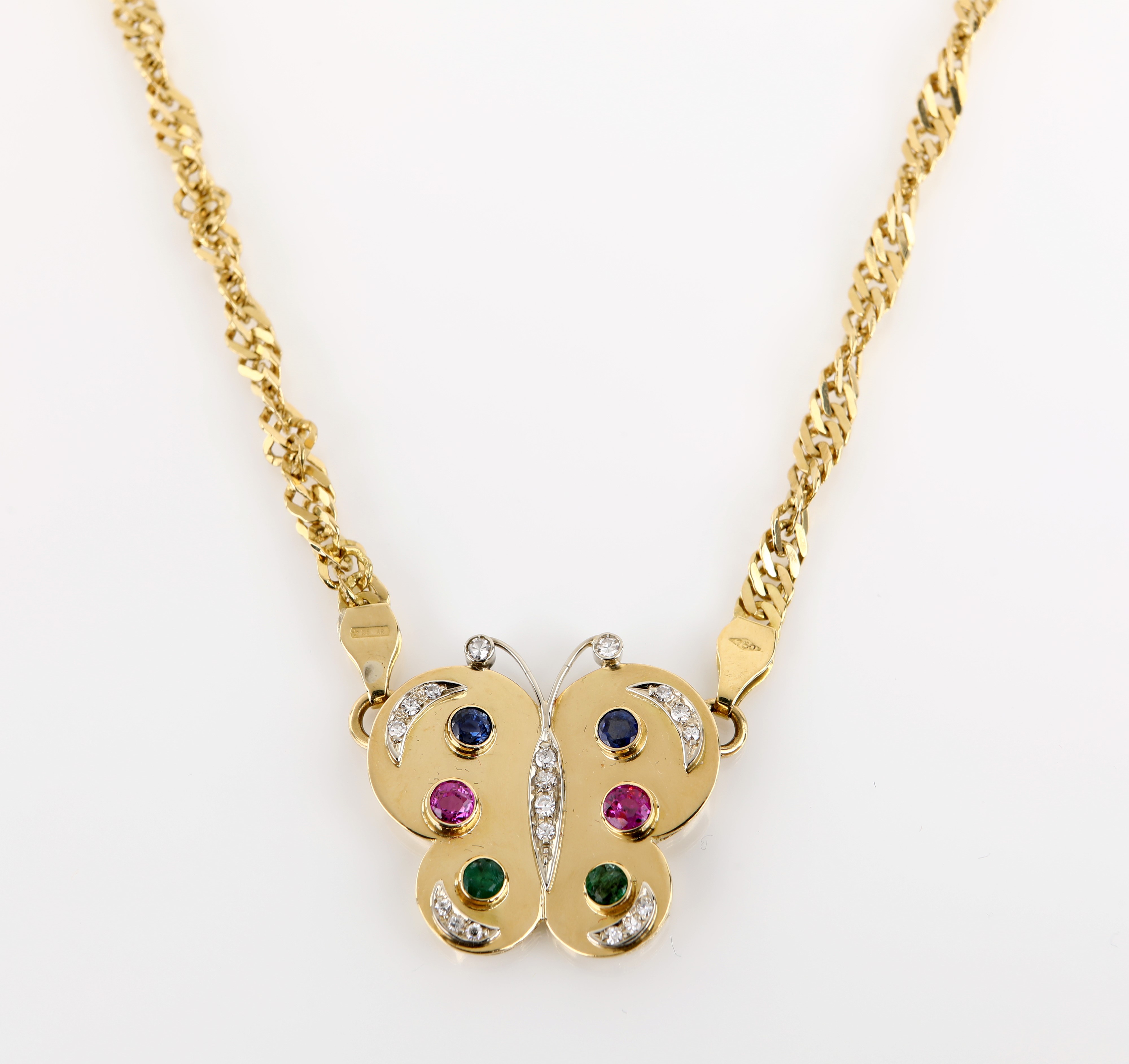 Collana farfalla in oro zaffiri rubini, smeraldi e brillanti