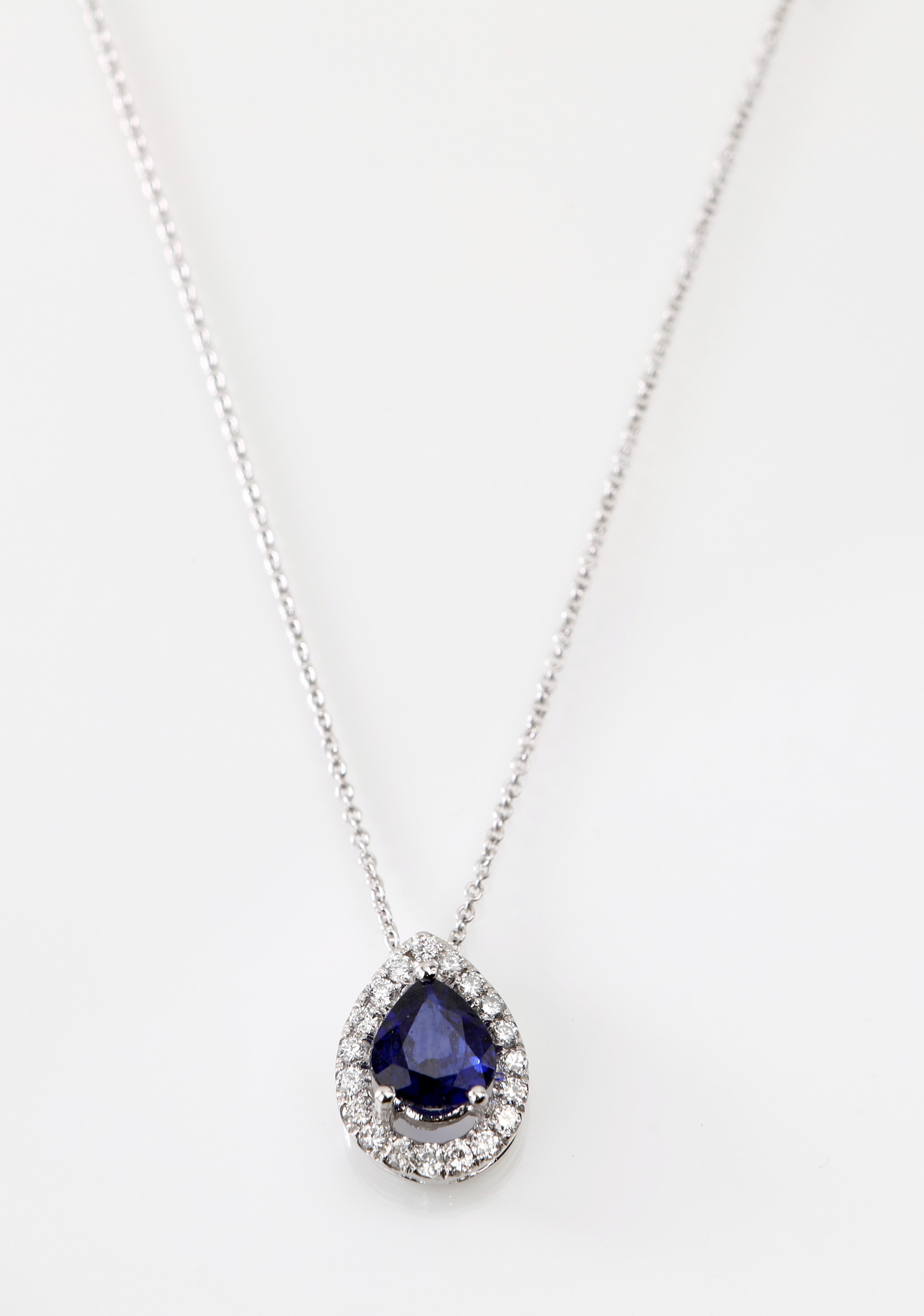 Oro bianco 750/000, zaffiro in taglio goccia ct. 0,60, diamanti in taglio rotondo brillante ct. 0,20. Peso complessivo gr. 1,70