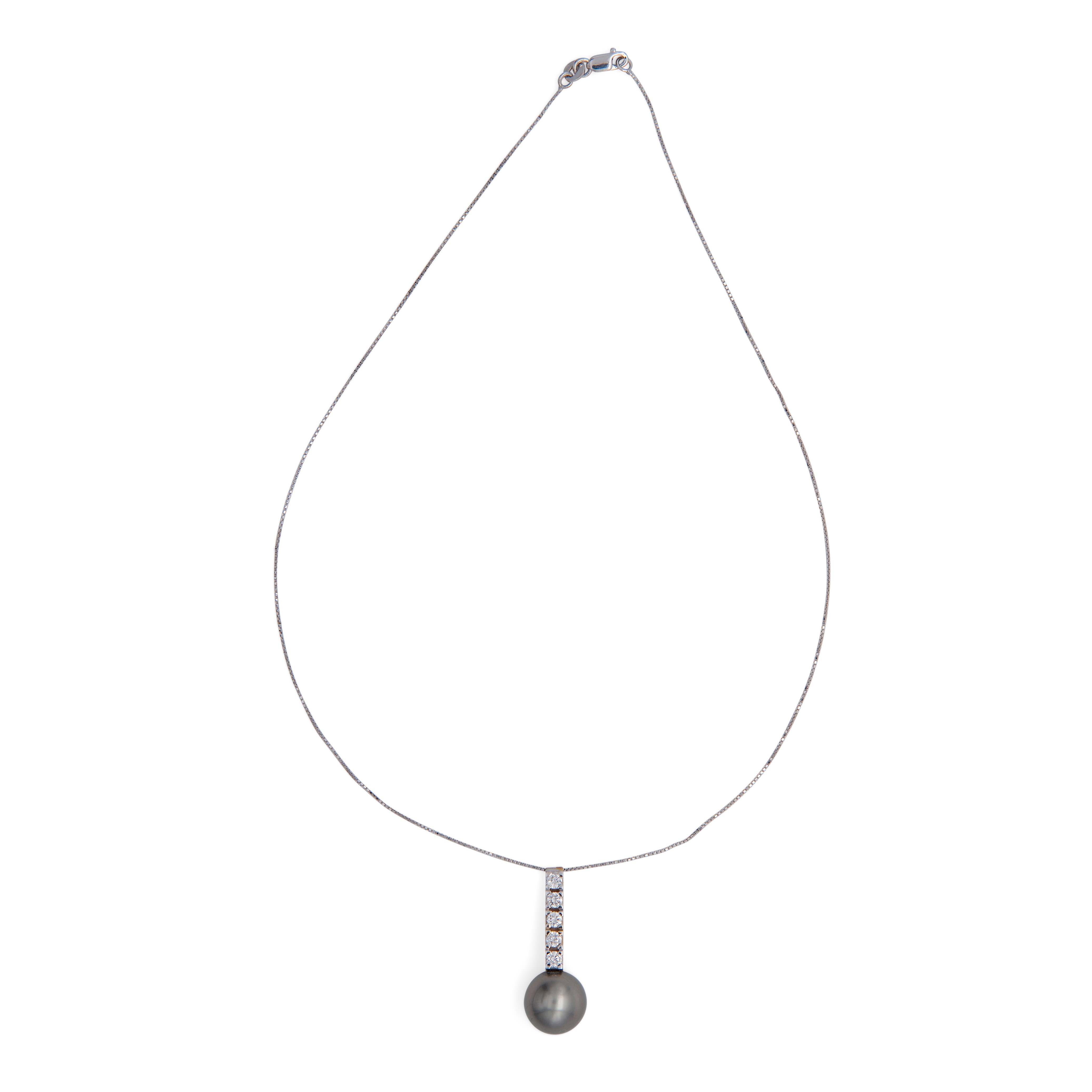 Oro bianco 750/000, perla mm 12, brillanti ct. 0,60 ca, prob. G - VVS. Peso complessivo gr. 6,5.