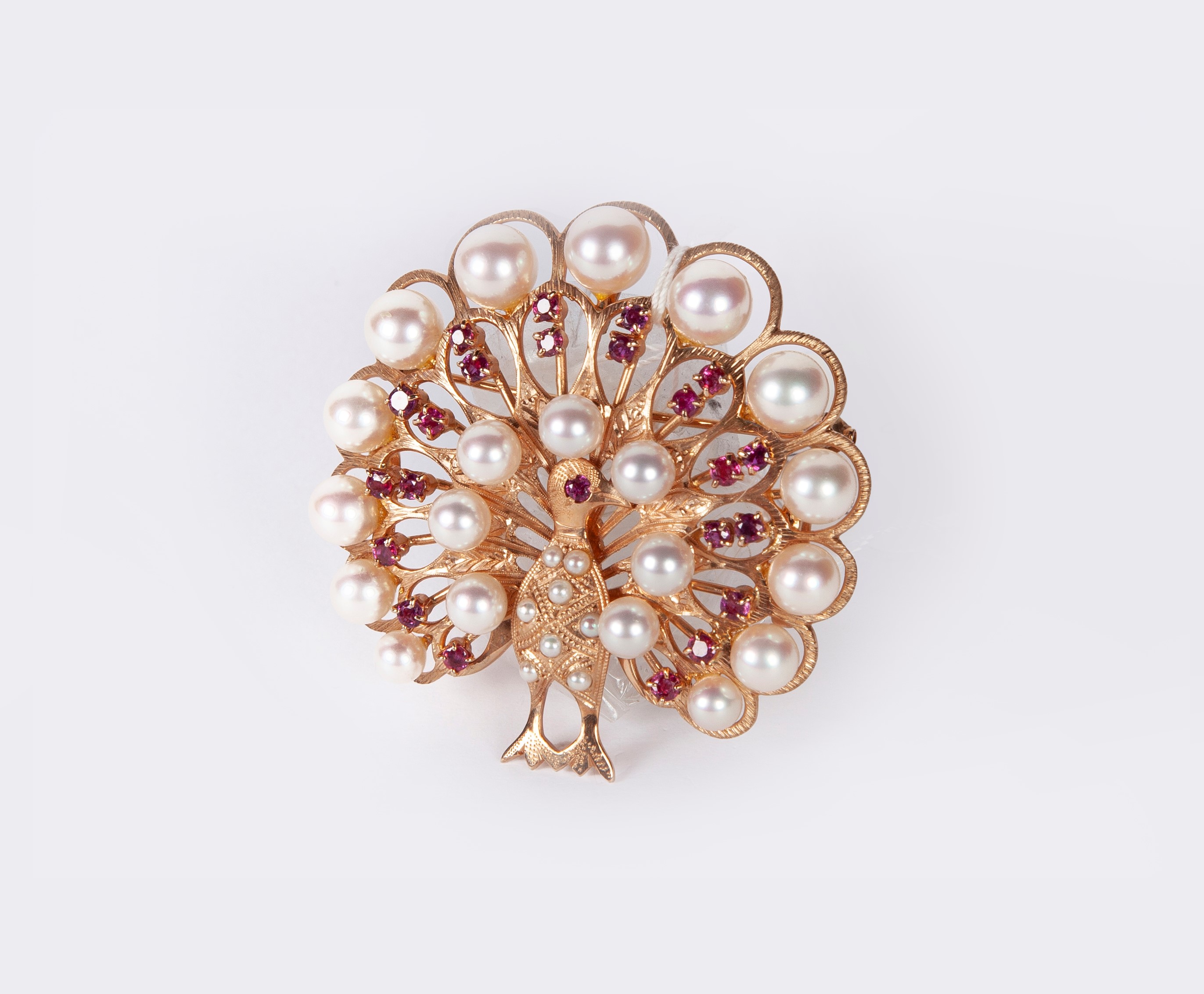 Spilla anni '50 in oro pavone con perle coltivate e rubini