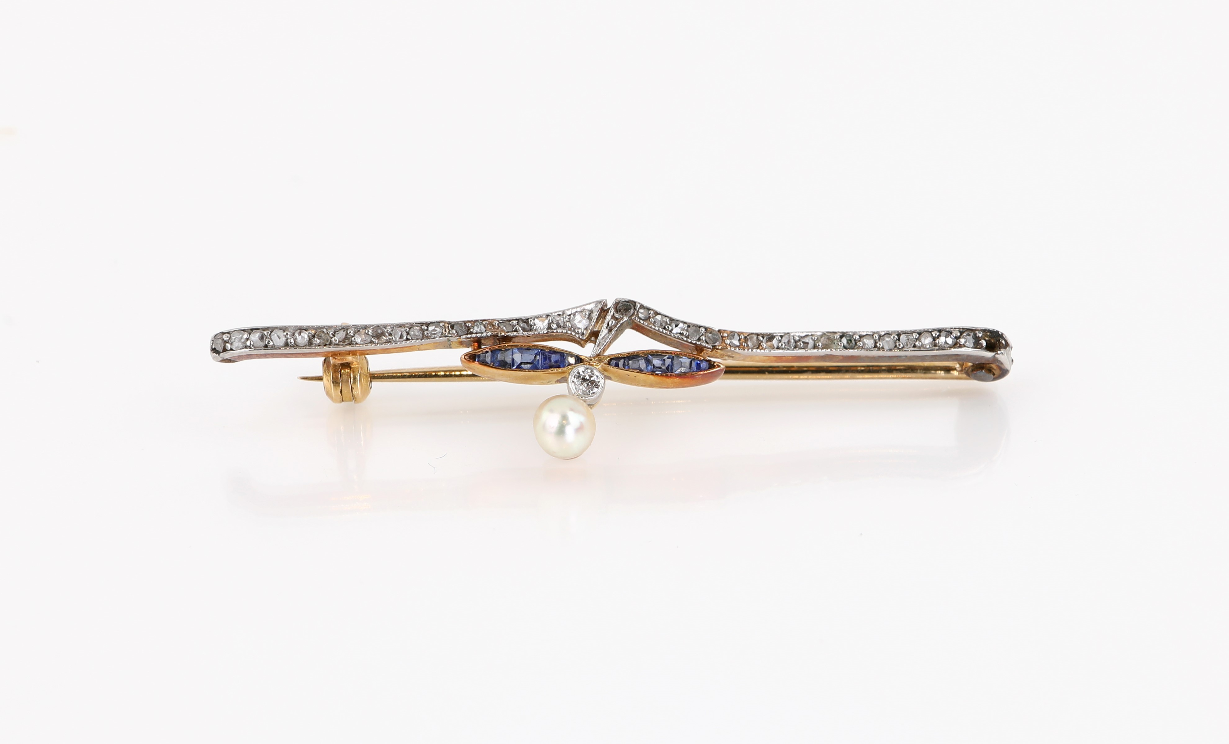 Spilla antica in oro, argento, perla, diamanti e zaffiri