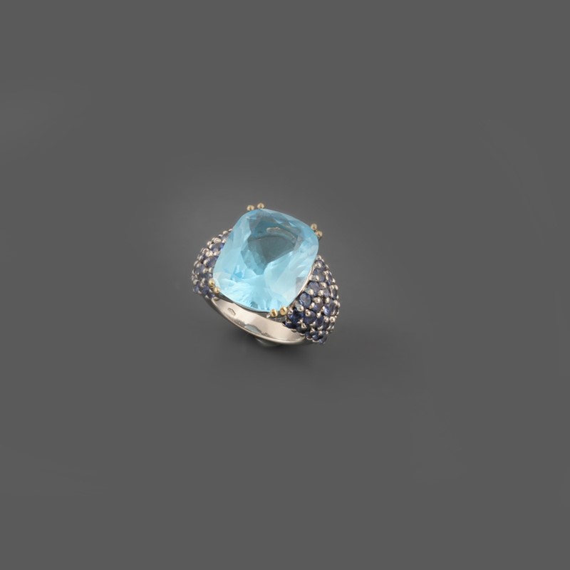 in oro bianco con topazio azzurro centrale ornato da ioliti ai lati, una mancante, gr. 18,1. Misura 14