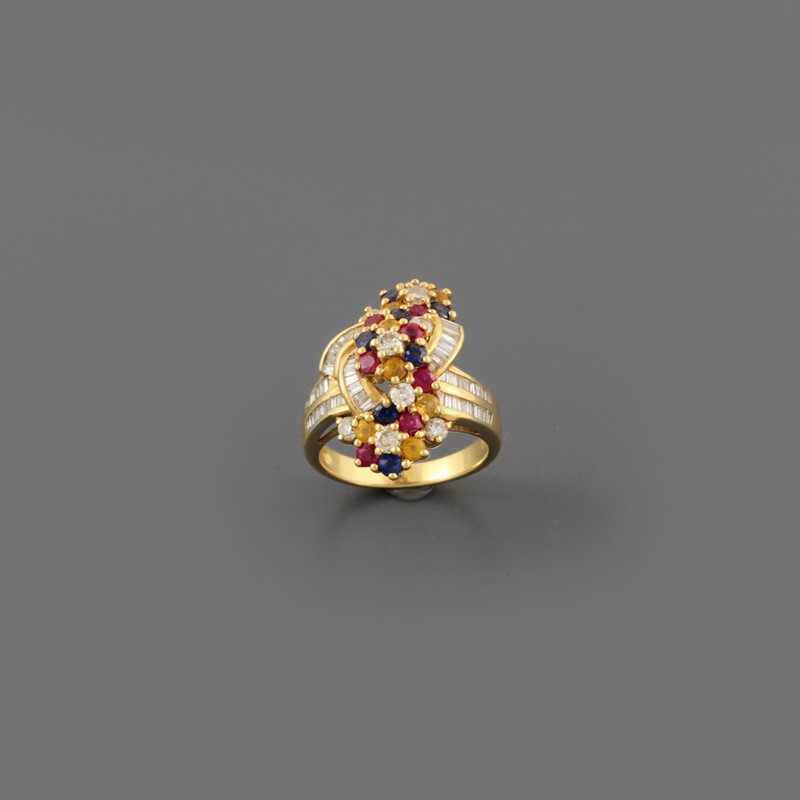 in oro giallo a motivi floreali con rubini, zaffiri, corindoni gialli e diamanti. Diamanti del peso complessivo di 1,00 ct ca., gr. 15,5. Sbeccature. Misura 15