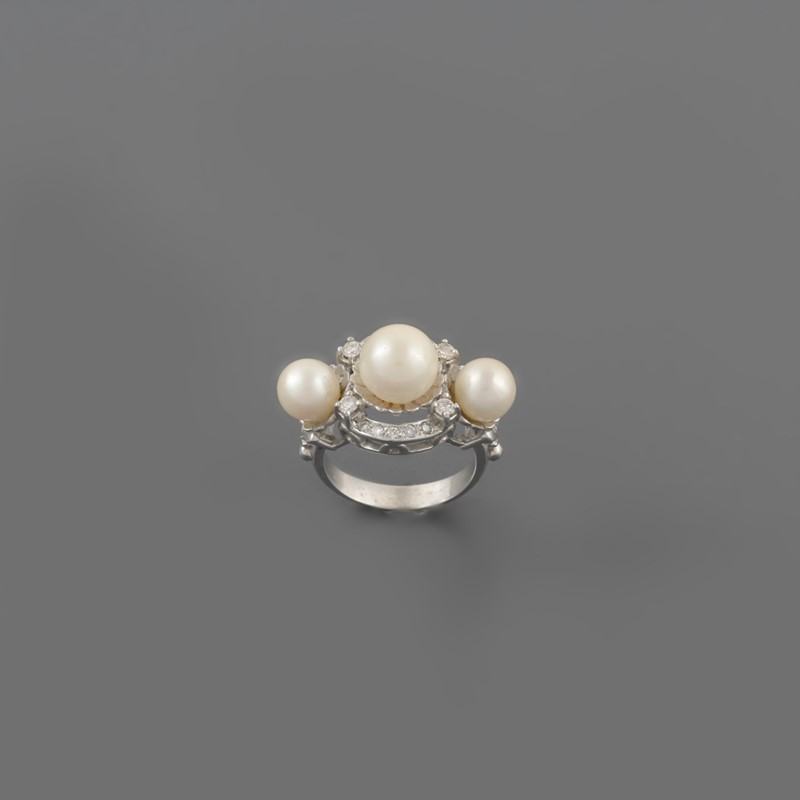 in oro bianco con tre perle coltivate, centrale 8,9 mm, laterali 7,1 mm, brillanti a contorno, gr. 8,7. Misura 15