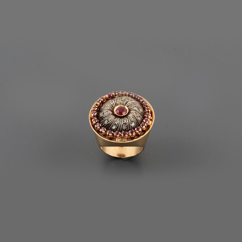 in oro giallo e argento a forma di rosone, diamanti e rubini, gr. 15,1. Misura 17