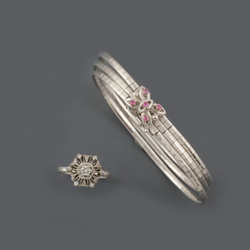 in oro bianco a tre segmenti snodati, chiusura con a motivi floreali, piccoli rubini. Anello in oro bianco a forma di rosone con piccoli brillanti. Peso complessivo gr. 27,8. Lunghezza bracciale 21 cm Misura anello 18