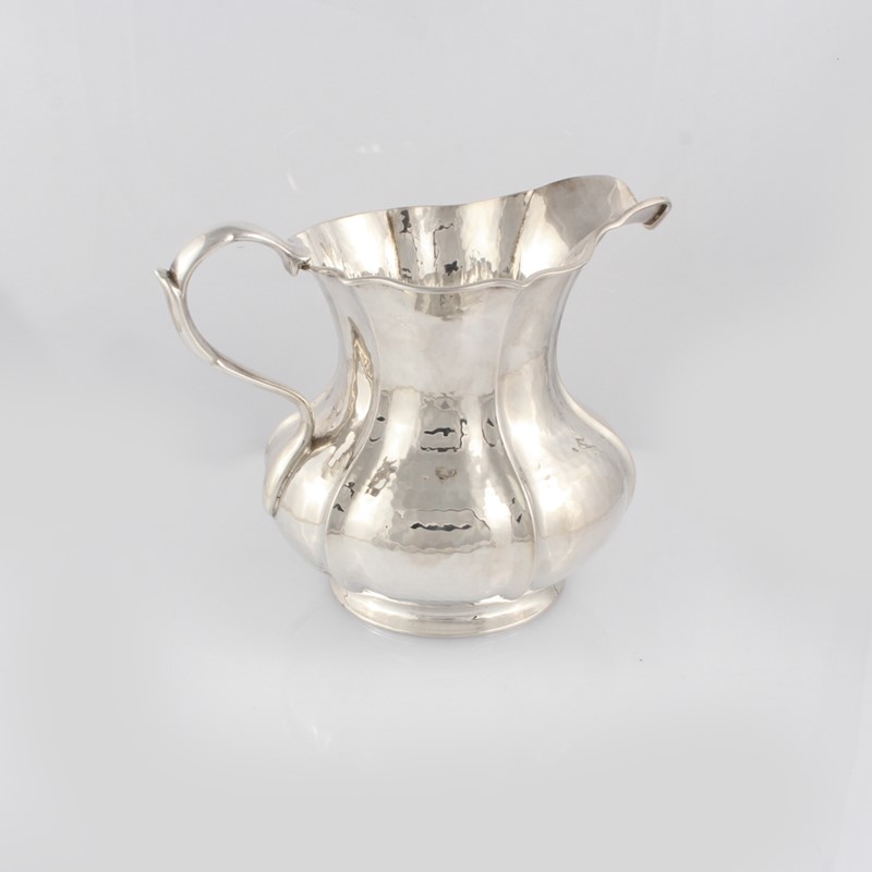 in argento 800 a corpo globulare baccellato con costolature, interamente battuto, con versatoio a foglia e manico applicato a voluta, gr. 678 ca., altezza 16 cm ca. Manifattura italiana Numerario 30 PD, ditta Zaramella F.lli – Padova