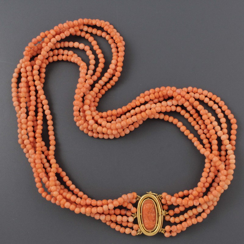 torchon a sette fili, sfere in corallo 4,5 mm. Chiusura in oro giallo con a figura femminile in corallo, gr. 116,2. Lunghezza 53 cm
