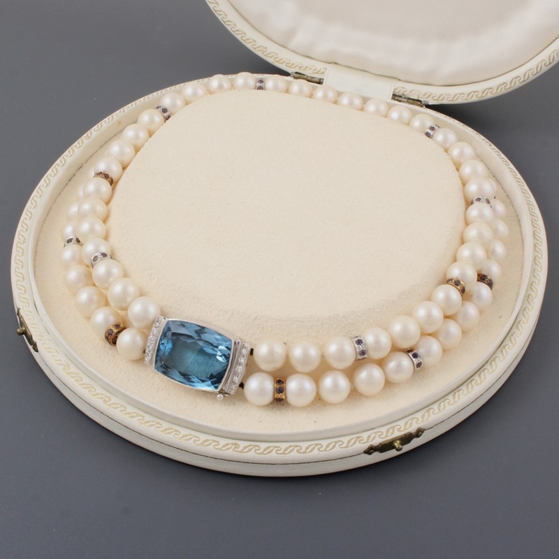 due fili di perle coltivate alternate a rondelle in oro giallo e bianco con piccoli zaffiri. Chiusura in oro bianco con topazio azzurro di forma rettangolare al centro, piccoli brillanti, gr. 112,7. Corredata da custodia. Lunghezza 37 cm