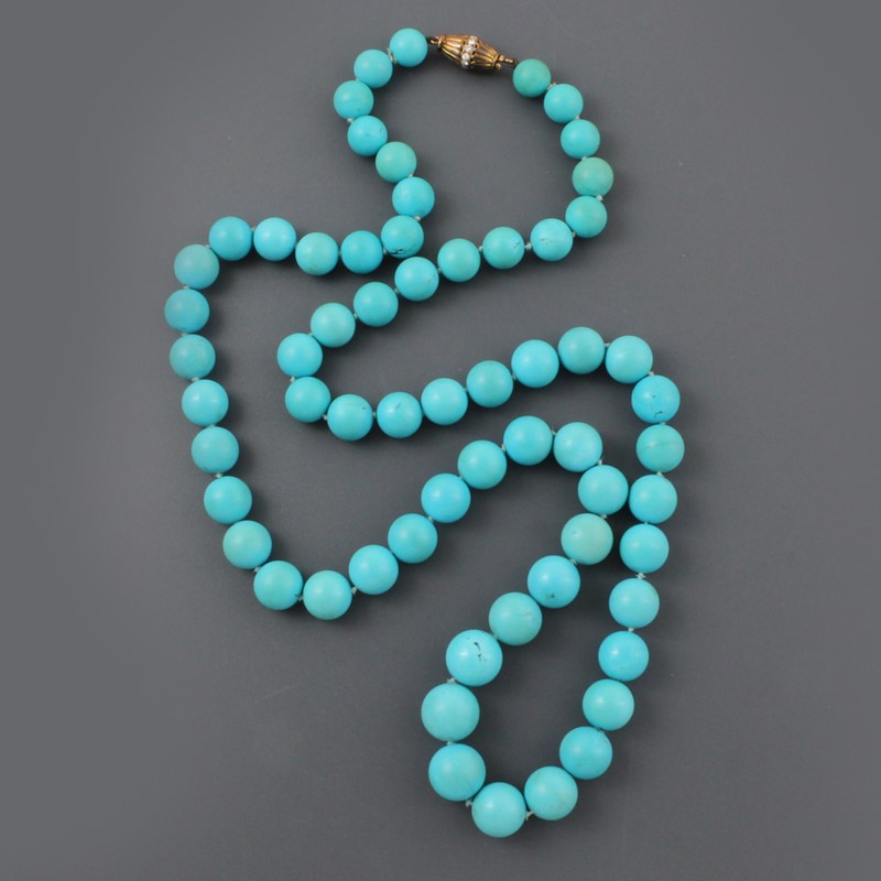 a sfere a scalare di turchesi 14,6/10,3 mm con chiusura in oro giallo a forma ovale con piccoli brillanti, gr. 161,5. Lunghezza 82 cm