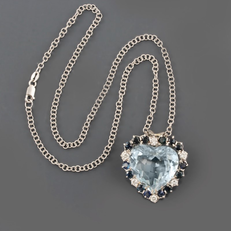 in oro bianco, ciondolo a forma di cuore con topazio azzurro centrale ornato da zaffiri e brillanti, gr. 18,3. Lunghezza 40 cm
