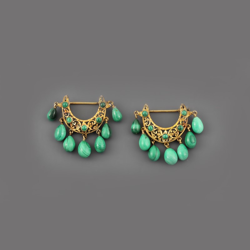 in argento dorato a semiluna finemente traforate con pendenti in malachite a goccia, gr. 15,5.