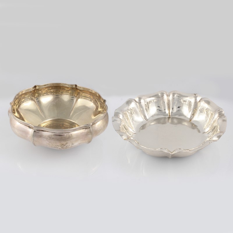 in argento 800 a forma tonda con falda martellata a corolla e a corpo liscio polilobato, del peso complessivo di gr. 613 ca., dimensioni 24 x 5 e 20 x 8 cm. Numerario 29 PD, ditta Greggio Rino – Padova Numerario non leggibile, inciso SANDONA’ Vicenza