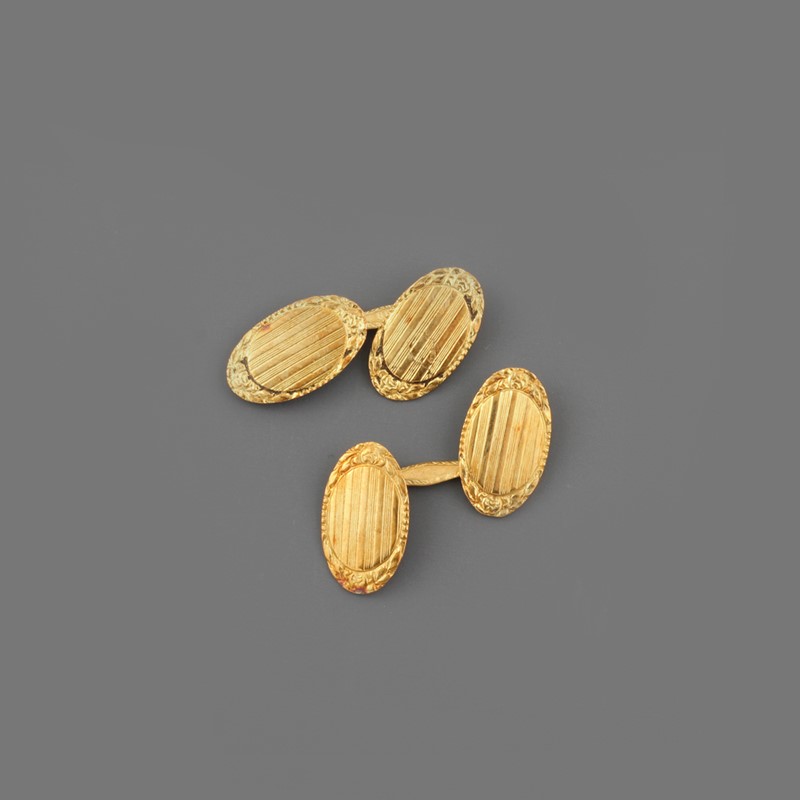 in oro giallo a forma ovale finemente incisi, gr. 6,4.