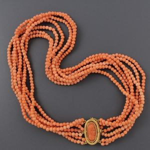torchon a sette fili, sfere in corallo 4,5 mm. Chiusura in oro giallo con a figura femminile in corallo, gr. 116,2. [..]