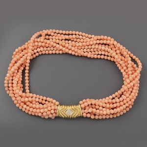 torchon a nove fili di sfere in corallo 4,9 mm, chiusura in oro giallo fesonato con piccoli brillanti, gr. 136,7. [..]