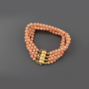 a quattro fili di sfere in corallo 4,9 mm, chiusura in oro giallo fesonato e bombato, gr. 26,9. Lunghezza 18,5 [..]