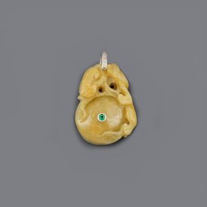 in giadeite gialla incisa, piccola tsavorite al centro e brillanti, gr. 26. Corredato da custodia.