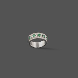 in oro bianco con cinque smeraldi disposti in linea e piccoli brillanti del peso complessivo di 0,60 ct ca., gr. [..]