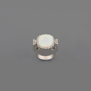in oro bianco con al centro grande opale bianco a forma quadrata contornata da piccoli brillanti, gr. 17,6. Misura [..]