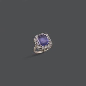 in oro bianco con zaffiro centrale a forma rettangolare del peso di 5,00 ct ca., brillanti a contorno del peso [..]