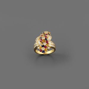 in oro giallo a motivi floreali con rubini, zaffiri, corindoni gialli e diamanti. Diamanti del peso complessivo [..]