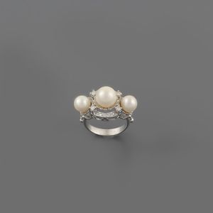 in oro bianco con tre perle coltivate, centrale 8,9 mm, laterali 7,1 mm, brillanti a contorno, gr. 8,7. Misura [..]