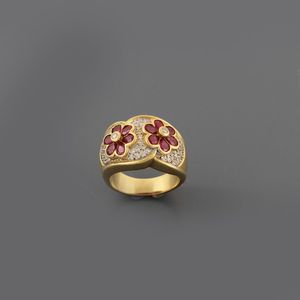 a fascia in oro giallo, margherite con rubini e brillanti. Brillanti del peso complessivo di 0,50 ct ca., gr. [..]