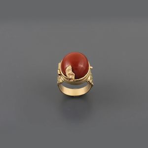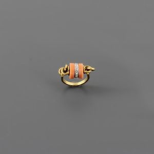 in oro giallo, elemento a due dischi in corallo e uno centrale in oro bianco con diamanti, gr. 6,7. Misura 9 [..]