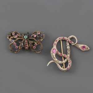 in oro e argento raffiguranti un serpente e una farfalla stilizzati con rubini, smeraldi, zaffiri e diamanti, [..]