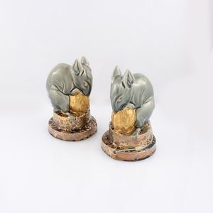 di due porcellane policrome raffiguranti un topolino con noce, altezza 15 cm. (lievi difetti) Firmate sul fondo [..]