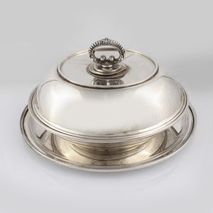 in argento 800 composto da una legumiera a corpo circolare liscio e coperchio con presa ad anello con volute e [..]