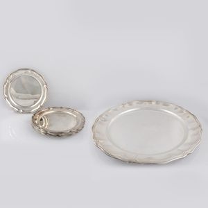 in argento 800 costituito da un vassoio a corpo tondo liscio con falda mossa e bordo mistilineo multi gradinato [..]