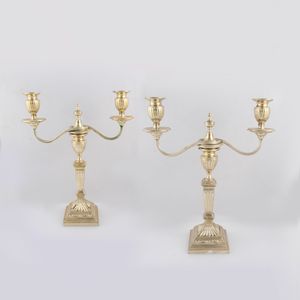 in argento 800 su piede quadrato modanato con rastremature che proseguono sul fusto, braccia a volute intrecciate [..]