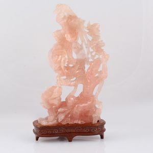 in quarzo rosa inciso con figure e cane di Fo, piedistallo in legno, altezza totale 22 cm.