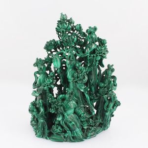 in malachite finemente incisa raffigurante sei “Guanyin” con fiori e ventagli. Altezza 21,5 cm